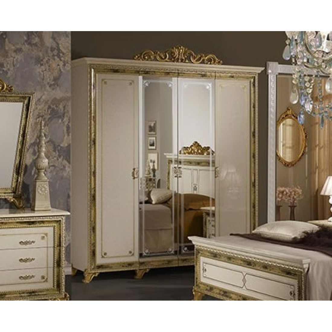 Четырехстворчатый шкаф для одежды Катя (беж) от Российской фабрики «ДИА мебель» выполнен в бежевом цвете с  глянцевым покрытием и позолоченными, резными вставками на фасадах. Шкаф поделен на три части и имеет не только полки для одежды но и большую штангу для вешалок. Такой большой и многофункциональный шкаф будет незаменимым модулем в вашей спальне.