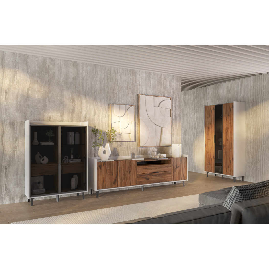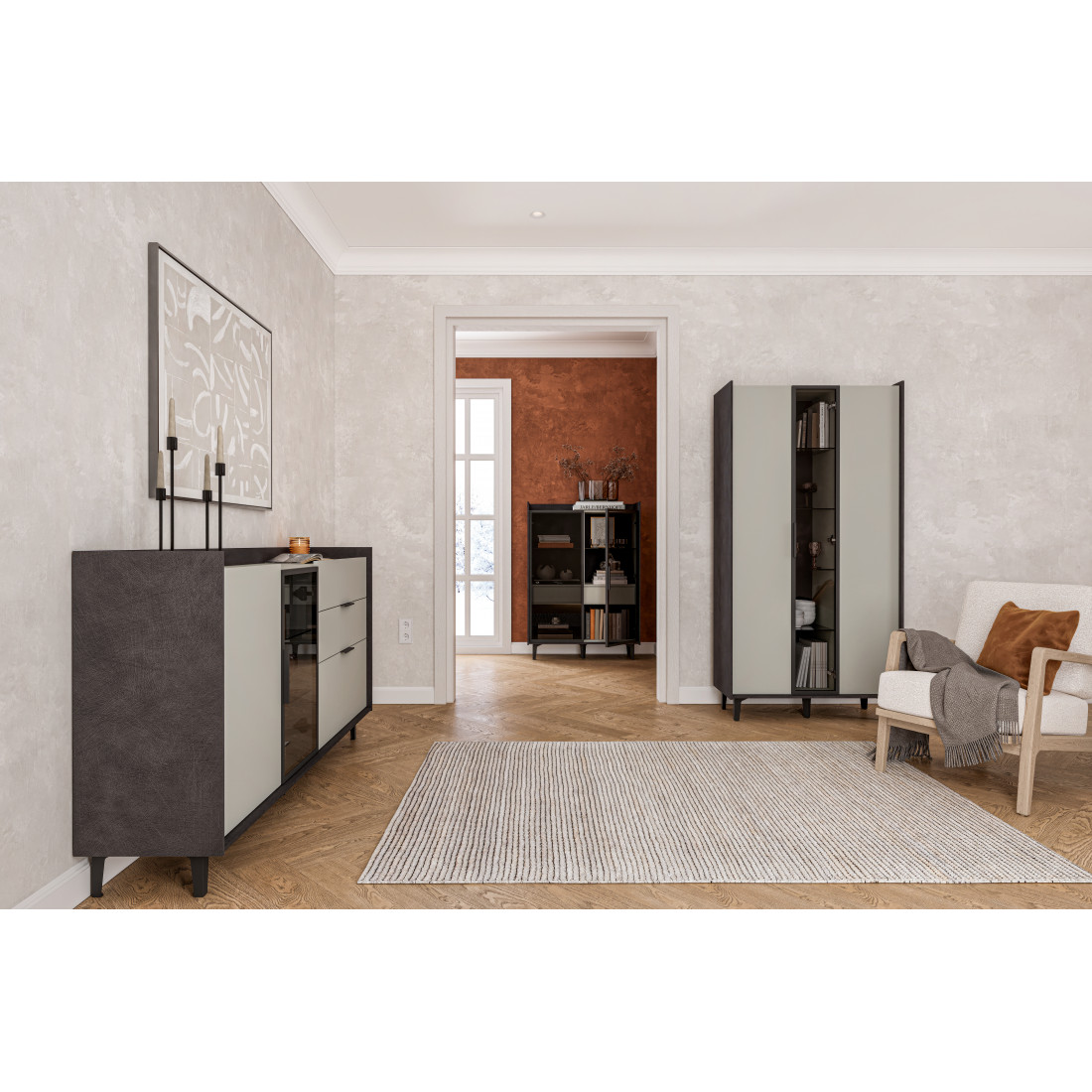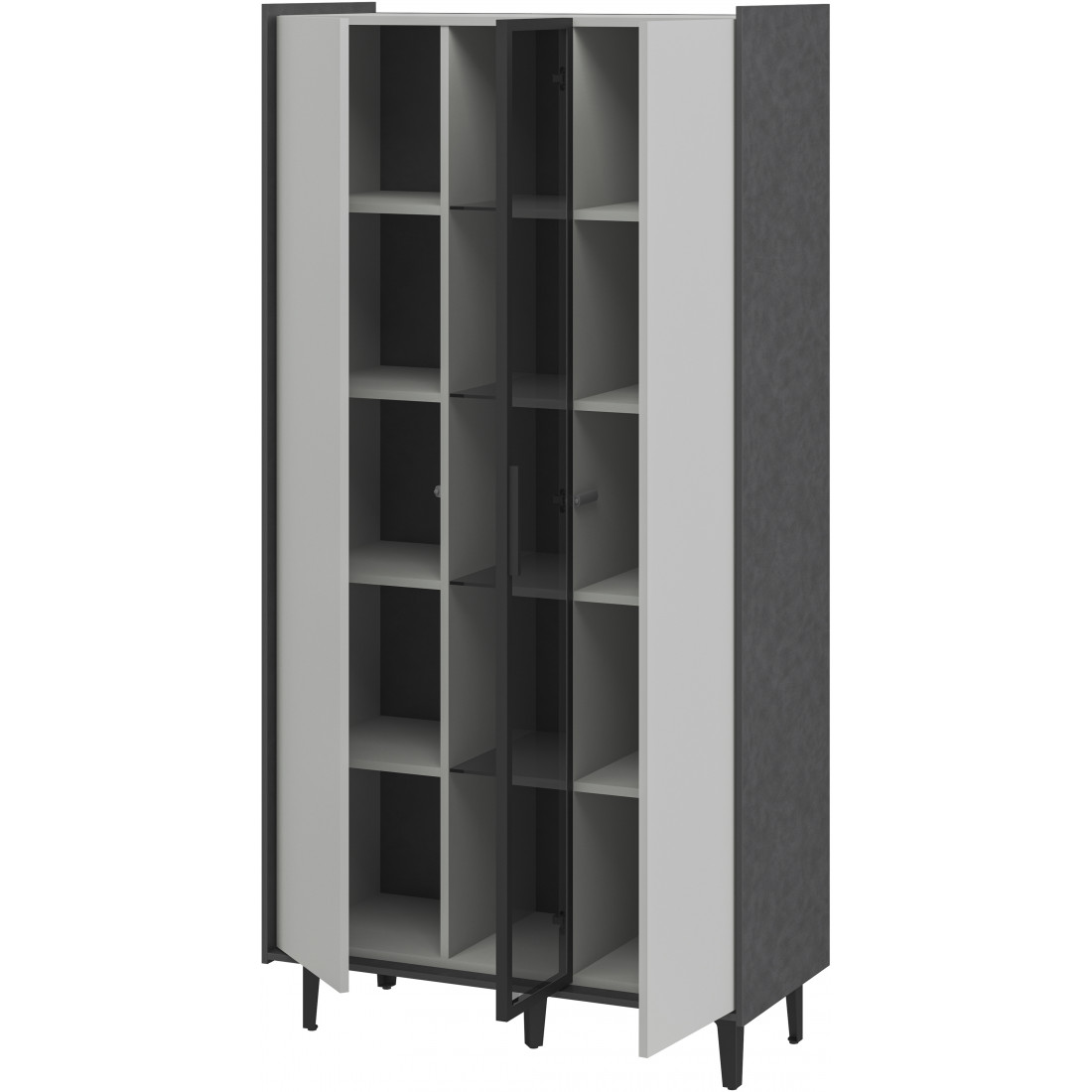 Элегантный шкаф Модена создает изысканную атмосферу в вашей гостиной. Предлагается в трех стильных вариантах цветов: Белый-Дуб Элисон, Лунный камень-жемчуг, Металл Бруклин-лунный жемчуг. Ножки из металла обеспечивают прочную поддержку. Темное стекло добавляет утонченности дизайну. Шкаф имеет два отделения с полками для удобного хранения, а также одно отделение со стеклянными полками и стеклянным фасадом, придающим ему элегантность. Идеальное решение для организации пространства в вашей гостиной.